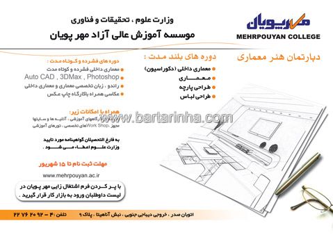وزارت علوم ، تحقیقات و فناوری کالج آموزش عالی آزاد مهرپویان برای ترم بهمن ۸۸ در دوره های بلند مدت بدون کنکور ورودی تا ۳۰ دی ثبت نام می نماید