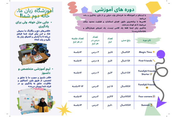 کلاس های دنج و رنگارنگ ما محیطی شاد و امن برای فرزند شما را فراهم می کند تا با آرامش و اشتیاق زبان یاد بگیرد و رشد کند.
